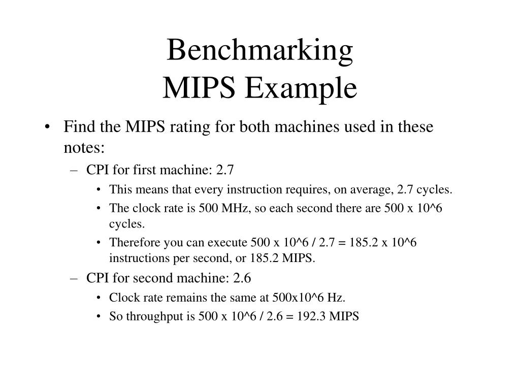 BenchmarkingMIPS Example • Find the MIPS rating for both machines used in these notes: • CPI for first machine: 2.7 • This means that every instruction requires, on average, 2.7 cycles. • The clock rate is 500 MHz, so each second there are 500 x 10^6 cycles. • Therefore you can execute 500 x 10^6 / 2.7 = 185.2 x 10^6 instructions per second, or 185.2 MIPS. • CPI for second machine: 2.6 • Clock rate remains the same at 500x10^6 Hz. • So throughput is 500 x 10^6 / 2.6 = 192.3 MIPS