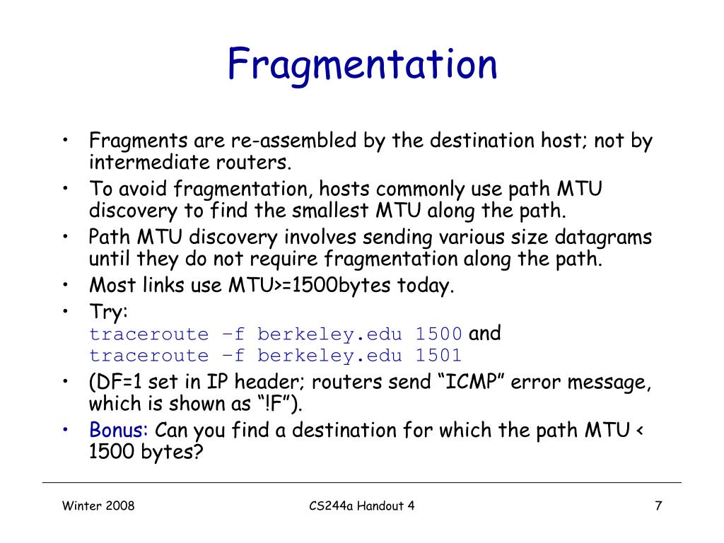 Fragmentation • Fragments are re-assembled by the destination host; not by intermediate routers. • To avoid fragmentation, hosts commonly use path MTU discovery to find the smallest MTU along the path. • Path MTU discovery involves sending various size datagrams until they do not require fragmentation along the path. • Most links use MTU>=1500bytes today. • Try: traceroute –f berkeley.edu 1500 andtraceroute –f berkeley.edu 1501 • (DF=1 set in IP header; routers send “ICMP” error message, which is shown as “!F”). • Bonus: Can you find a destination for which the path MTU < 1500 bytes? CS244a Handout 4