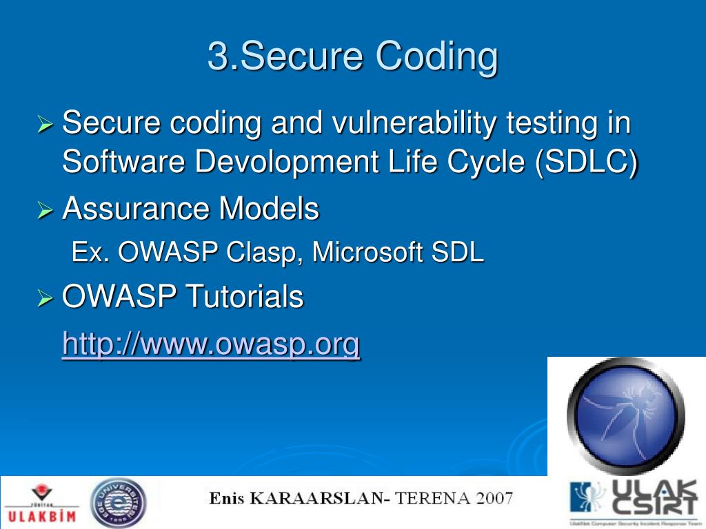 3.Secure Coding • Secure coding and vulnerability testing in Software Devolopment Life Cycle (SDLC) • Assurance Models Ex. OWASP Clasp, Microsoft SDL • OWASP Tutorials http://www.owasp.org