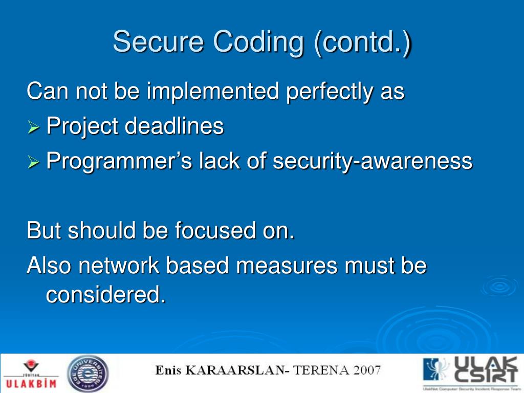 Secure Coding (contd.) Can not be implemented perfectly as • Project deadlines • Programmer’s lack of security-awareness But should be focused on. Also network based measures must be considered.