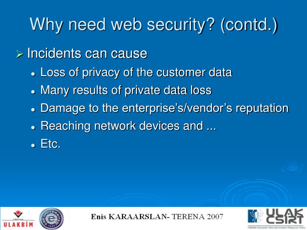 Why need web security? (contd.) • Incidents can cause • Loss of privacy of the customer data • Many results of private data loss • Damage to the enterprise’s/vendor’s reputation • Reaching network devices and ... • Etc.