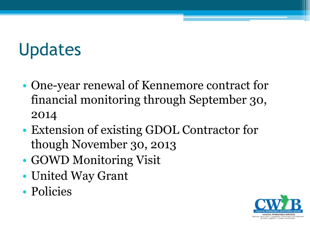 Updates • One-year renewal of Kennemore contract for financial monitoring through September 30, 2014 • Extension of existing GDOL Contractor for though November 30, 2013 • GOWD Monitoring Visit • United Way Grant • Policies