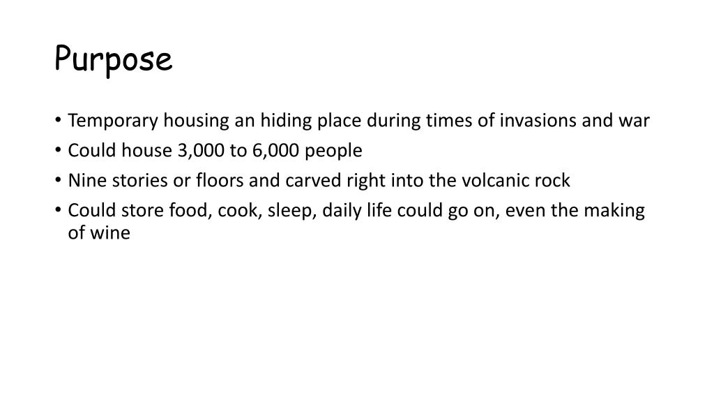 Purpose • Temporary housing an hiding place during times of invasions and war • Could house 3,000 to 6,000 people • Nine stories or floors and carved right into the volcanic rock • Could store food, cook, sleep, daily life could go on, even the making of wine