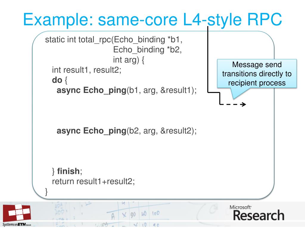 Example: same-core L4-style RPC static inttotal_rpc(Echo_binding *b1, Echo_binding *b2, intarg) { int result1, result2; do { asyncEcho_ping(b1, arg, &result1); asyncEcho_ping(b2, arg, &result2); } finish; return result1+result2; }