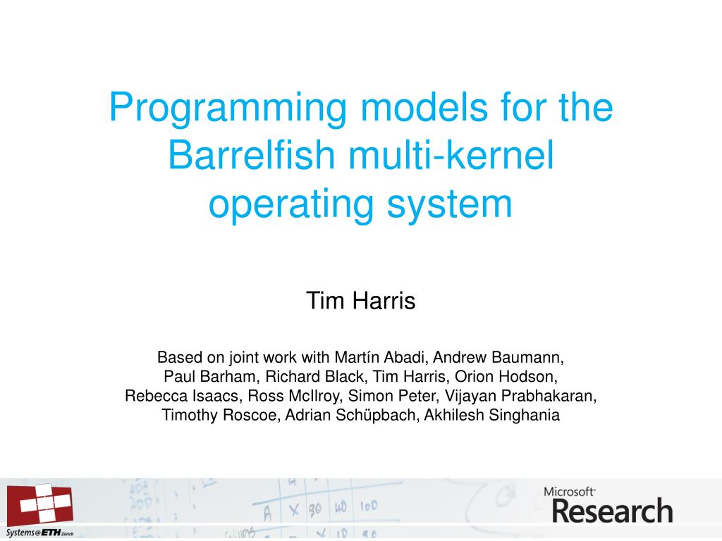 Programming models for the Barrelfish multi-kernel operating system Tim Harris Based on joint work with Martín Abadi, Andrew Baumann, Paul Barham, Richard Black, Tim Harris, Orion Hodson, Rebecca Isaacs, Ross McIlroy, Simon Peter, Vijayan Prabhakaran, Timothy Roscoe, Adrian Schüpbach, Akhilesh Singhania