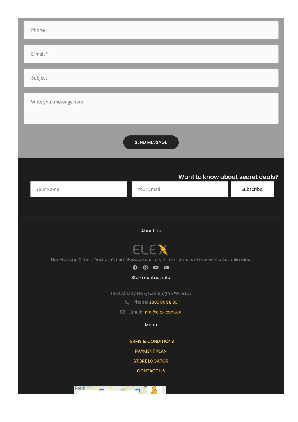 Phone E-mail * Subject Write your message here SEND MESSAGE Want to know about secret deals? Your Name Your Email Subscribe! About Us Elex Massage Chair is Australia's best Massage chairs with over 15 years of experience Australia wide. Store contact info 1382 Albany Hwy, Cannington WA 6107 Phone: 1300 00 98 00 Email: info@elex.com.au Menu TERMS & CONDITIONS PAYMENT PLAN STORE LOCATOR CONTACT US