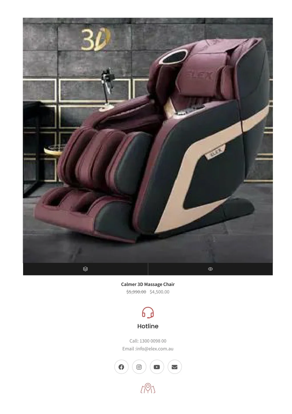 Calmer 3D Massage Chair $5,990.00 $4,500.00 Hotline Call: 1300 0098 00 Email :info@elex.com.au