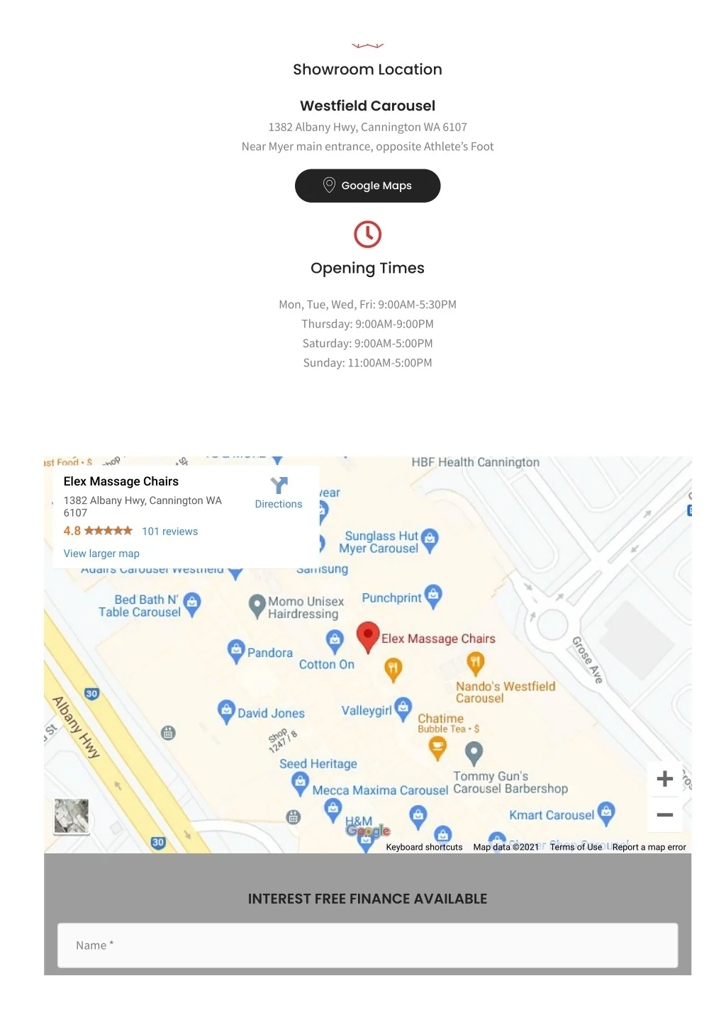 Showroom Location Westfield Carousel 1382 Albany Hwy, Cannington WA 6107 Near Myer main entrance, opposite Athlete’s Foot Google Maps Opening Times Mon, Tue, Wed, Fri: 9:00AM-5:30PM Thursday: 9:00AM-9:00PM Saturday: 9:00AM-5:00PM Sunday: 11:00AM-5:00PM Elex Massage Chairs 1382 Albany Hwy, Cannington WA 6107 4.8 101 reviews Directions View larger map Keyboard shortcuts Map data ©2021 Terms of Use Report a map error INTEREST FREE FINANCE AVAILABLE Name *