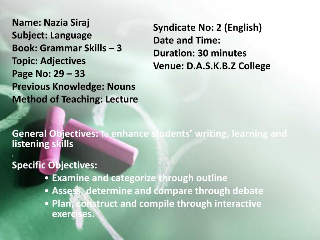 Name: Nazia Siraj Subject: Language Book: Grammar Skills – 3 Topic: Adjectives Page No: 29 – 33Previous Knowledge: NounsMethod of Teaching: Lecture General Objectives: To enhance students’ writing, learning and listening skills . Specific Objectives: Examine and categorize through outline Assess, determine and compare through debate Plan, construct and compile through interactive exercises. Syndicate No: 2 (English)Date and Time: Duration: 30 minutesVenue: D.A.S.K.B.Z College