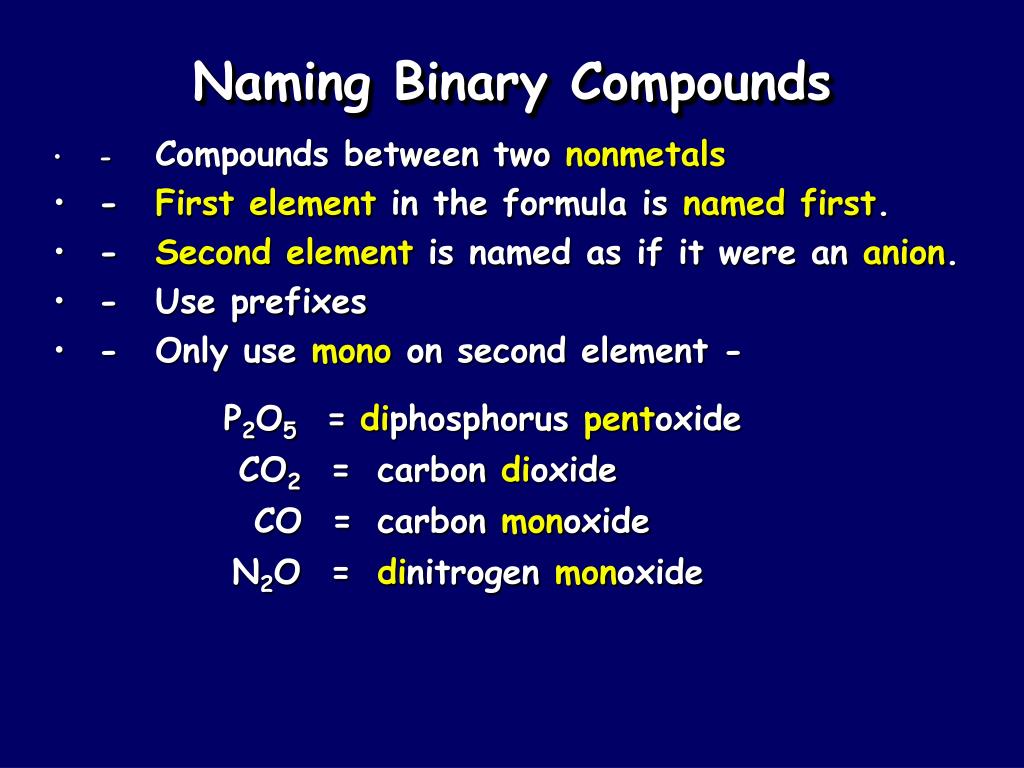 Naming Binary Compounds • -Compounds between two nonmetals • -First element in the formula is named first. • -Second element is named as if it were an anion. • - Use prefixes • - Only use mono on second element - P2O5 = diphosphorus pentoxide CO2 = carbon dioxide CO = carbon monoxide N2O = dinitrogen monoxide