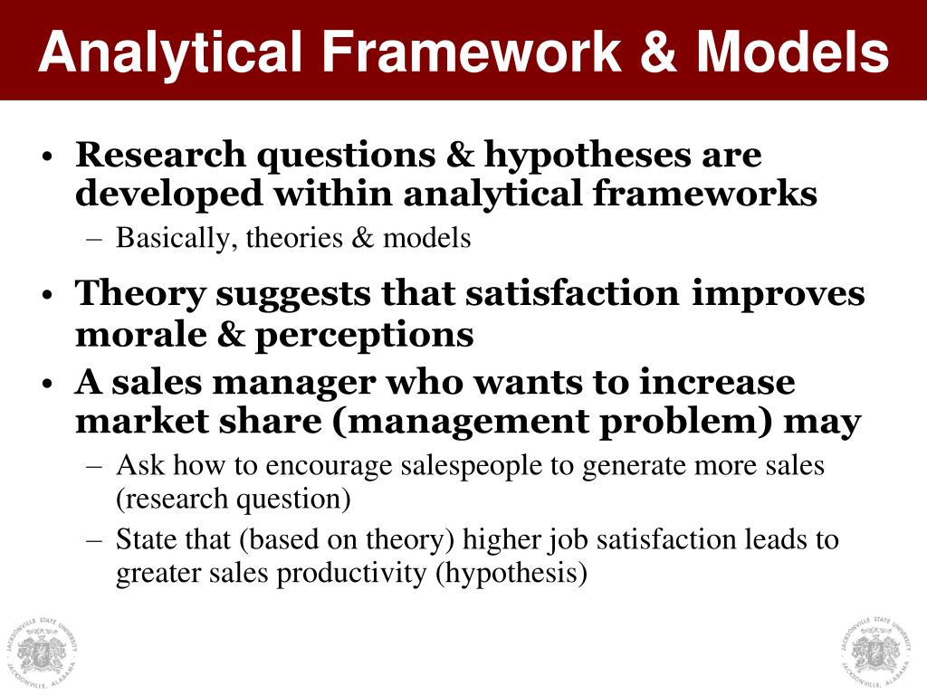 Analytical Framework & Models • Research questions & hypotheses are developed within analytical frameworks • Basically, theories & models • Theory suggests that satisfactionimproves morale & perceptions • A sales manager who wants to increase market share (management problem) may • Ask how to encourage salespeople to generate more sales (research question) • State that (based on theory) higher job satisfaction leads to greater sales productivity (hypothesis)