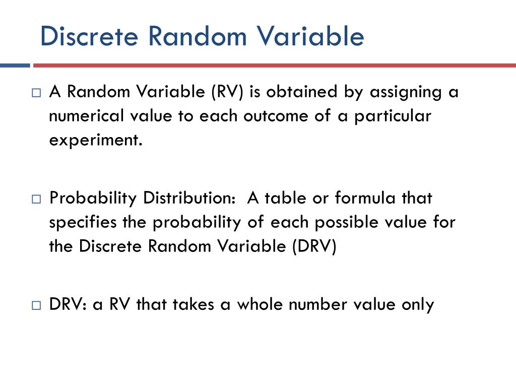 Discrete Random Variable • A Random Variable (RV) is obtained by assigning a numerical value to each outcome of a particular experiment. • Probability Distribution: A table or formula that specifies the probability of each possible value for the Discrete Random Variable (DRV) • DRV: a RV that takes a whole number value only
