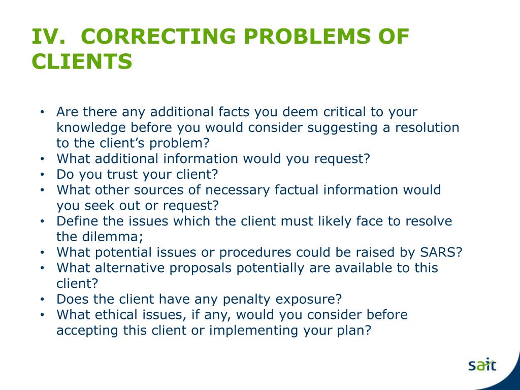 IV. CORRECTING PROBLEMS OF CLIENTS • Are there any additional facts you deem critical to your knowledge before you would consider suggesting a resolution to the client’s problem? • What additional information would you request? • Do you trust your client? • What other sources of necessary factual information would you seek out or request? • Define the issues which the client must likely face to resolve the dilemma; • What potential issues or procedures could be raised by SARS? • What alternative proposals potentially are available to this client? • Does the client have any penalty exposure? • What ethical issues, if any, would you consider before accepting this client or implementing your plan?
