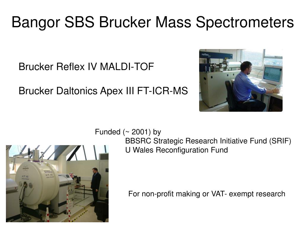 Bangor SBS Brucker Mass Spectrometers. Brucker Reflex IV MALDI-TOF Brucker Daltonics Apex III FT-ICR-MS. Funded (~ 2001) by BBSRC Strategic Research Initiative Fund (SRIF) U Wales Reconfiguration Fund. For non-profit making or VAT- exempt research. Capital costs of instruments: