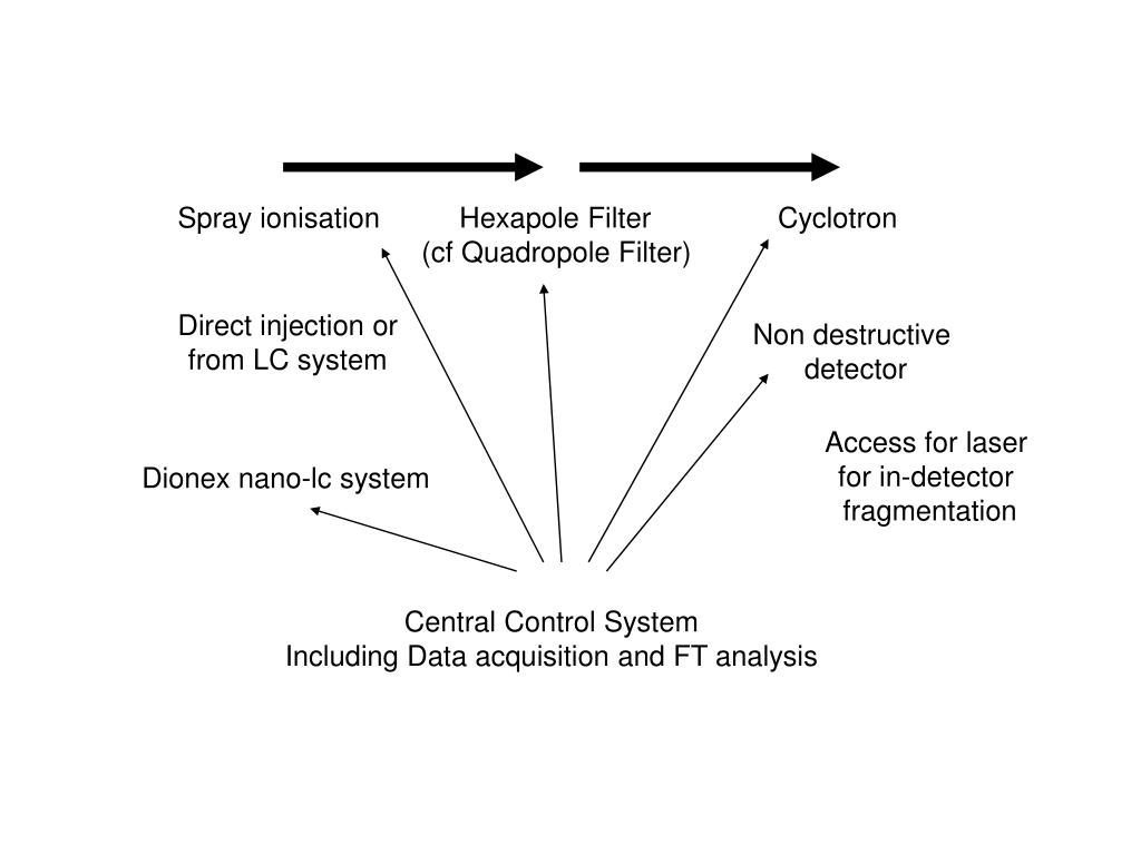 Spray ionisation Hexapole Filter Cyclotron (cf Quadropole Filter) Direct injection or from LC system Non destructive detector Access for laser for in-detector fragmentation Dionex nano-lc system Central Control System Including Data acquisition and FT analysis