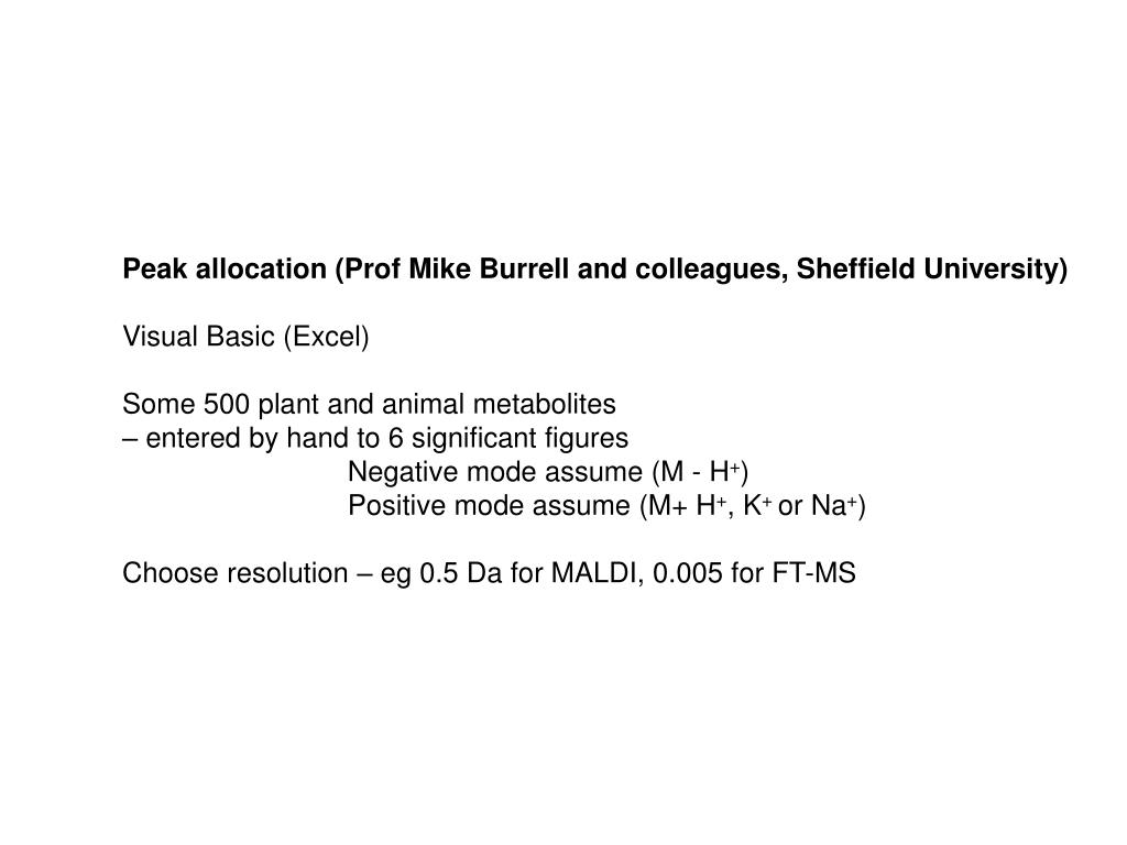 Peak allocation (Prof Mike Burrell and colleagues, Sheffield University) Visual Basic (Excel) Some 500 plant and animal metabolites – entered by hand to 6 significant figures Negative mode assume (M - H+) Positive mode assume (M+ H+, K+or Na+) Choose resolution – eg 0.5 Da for MALDI, 0.005 for FT-MS
