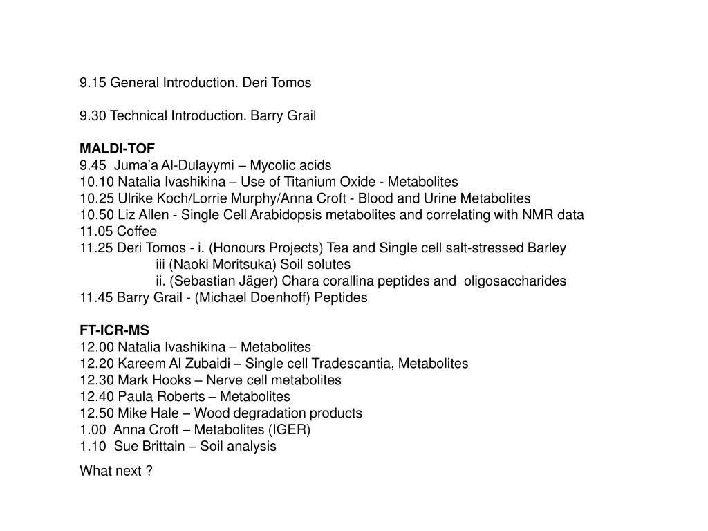 9.15 General Introduction. Deri Tomos 9.30 Technical Introduction. Barry Grail MALDI-TOF 9.45 Juma’a Al-Dulayymi – Mycolic acids 10.10 Natalia Ivashikina – Use of Titanium Oxide - Metabolites 10.25 Ulrike Koch/Lorrie Murphy/Anna Croft - Blood and Urine Metabolites 10.50 Liz Allen - Single Cell Arabidopsis metabolites and correlating with NMR data 11.05 Coffee 11.25 Deri Tomos - i. (Honours Projects) Tea and Single cell salt-stressed Barley iii (Naoki Moritsuka) Soil solutes ii. (Sebastian Jäger) Chara corallina peptides and oligosaccharides 11.45 Barry Grail - (Michael Doenhoff) Peptides FT-ICR-MS12.00 Natalia Ivashikina – Metabolites 12.20 Kareem Al Zubaidi – Single cell Tradescantia, Metabolites 12.30 Mark Hooks – Nerve cell metabolites 12.40 Paula Roberts – Metabolites 12.50 Mike Hale – Wood degradation products 1.00 Anna Croft – Metabolites (IGER) 1.10 Sue Brittain – Soil analysis What next ?