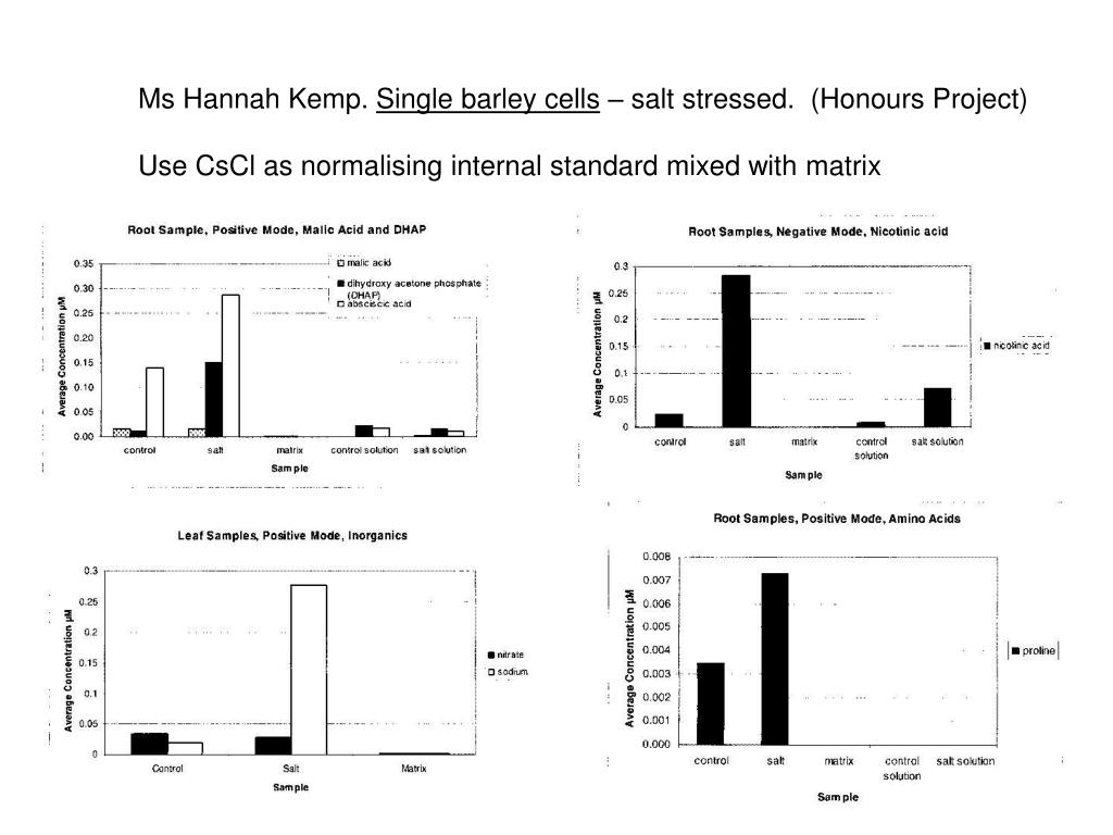 Ms Hannah Kemp. Single barley cells – salt stressed. (Honours Project) Use CsCl as normalising internal standard mixed with matrix
