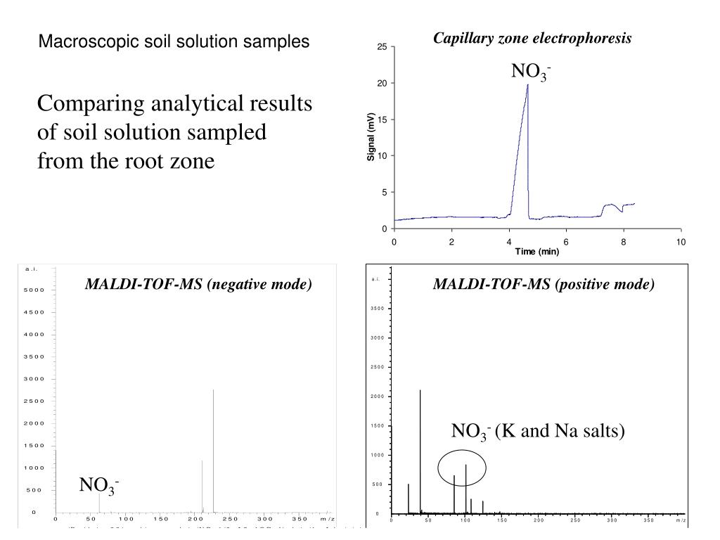 Capillary zone electrophoresis Macroscopic soil solution samples NO3- Comparing analytical results of soil solution sampled from the root zone MALDI-TOF-MS (negative mode) MALDI-TOF-MS (positive mode) NO3- (K and Na salts) NO3-