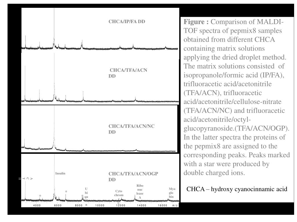 CHCA/IP/FA DD CHCA/TFA/ACN DD CHCA/TFA/ACN/NC DD CHCA/TFA/ACN/OGP DD Insulin ACTH Ribo nuc leaseA Myo glo bin Ubiquitin * Cyto chrome C * * • Figure : Comparison of MALDI-TOF spectra of pepmix8 samples obtained from different CHCA containing matrix solutions applying the dried droplet method. The matrix solutions consisted of isopropanole/formic acid (IP/FA), trifluoracetic acid/acetonitrile (TFA/ACN), trifluoracetic acid/acetonitrile/cellulose-nitrate (TFA/ACN/NC) and trifluoracetic acid/acetonitrile/octyl-glucopyranoside.(TFA/ACN/OGP). In the latter spectra the proteins of the pepmix8 are assigned to the corresponding peaks. Peaks marked with a star were produced by double charged ions. • . CHCA – hydroxy cyanocinnamic acid