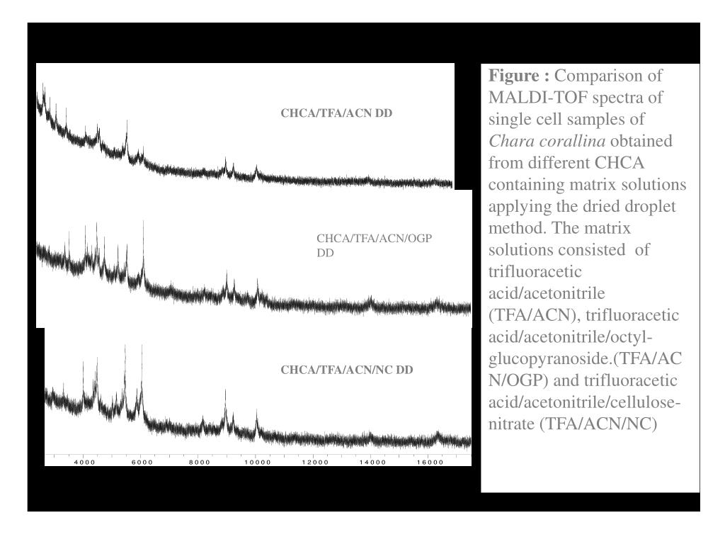 CHCA/TFA/ACN DD • CHCA/TFA/ACN/OGP DD CHCA/TFA/ACN/NC DD Figure : Comparison of MALDI-TOF spectra of single cell samples of Chara corallina obtained from different CHCA containing matrix solutions applying the dried droplet method. The matrix solutions consisted of trifluoracetic acid/acetonitrile (TFA/ACN), trifluoracetic acid/acetonitrile/octyl-glucopyranoside.(TFA/ACN/OGP) and trifluoracetic acid/acetonitrile/cellulose-nitrate (TFA/ACN/NC)