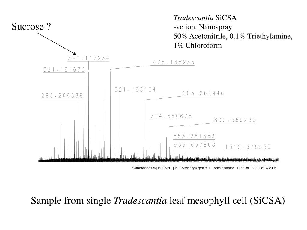Tradescantia SiCSA -ve ion. Nanospray 50% Acetonitrile, 0.1% Triethylamine, 1% Chloroform Sucrose ? /Data/bandat05/jun_05/20_jun_05/scsneg/2/pdata/1 Administrator Tue Oct 18 09:28:14 2005 Sample from single Tradescantia leaf mesophyll cell (SiCSA)