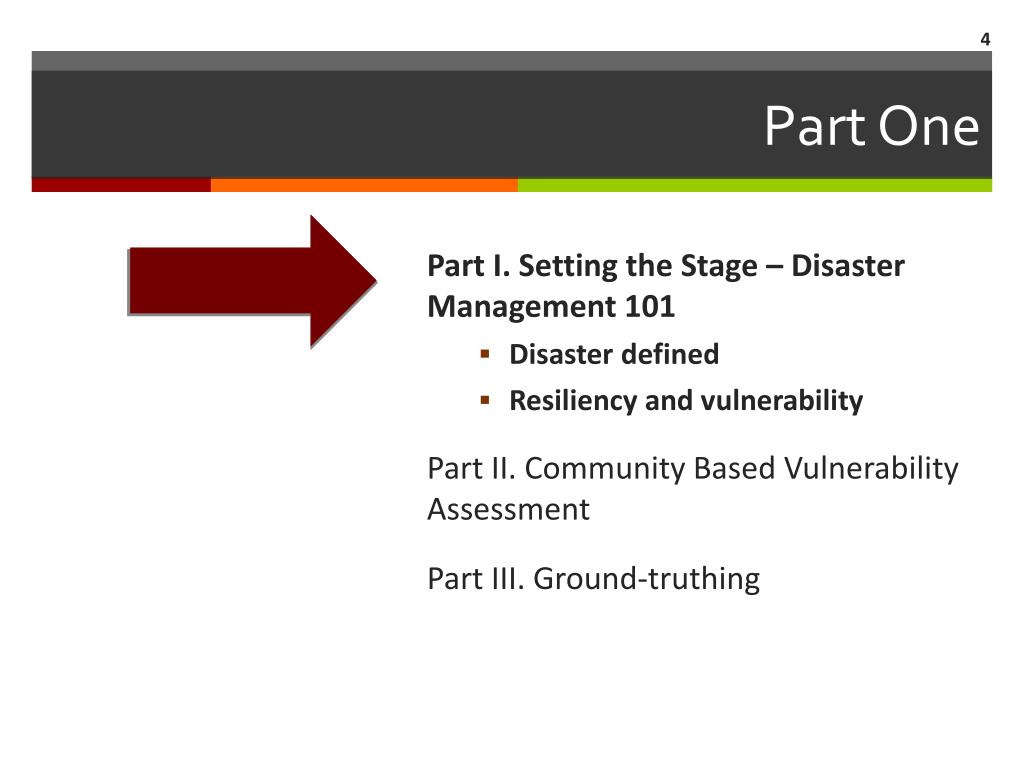 Part Three Part I. Setting the Stage – Disaster Management 101 • Disaster defined • Resiliency and vulnerability Part II. Community Based Vulnerability Assessment Part III. Ground-truthing