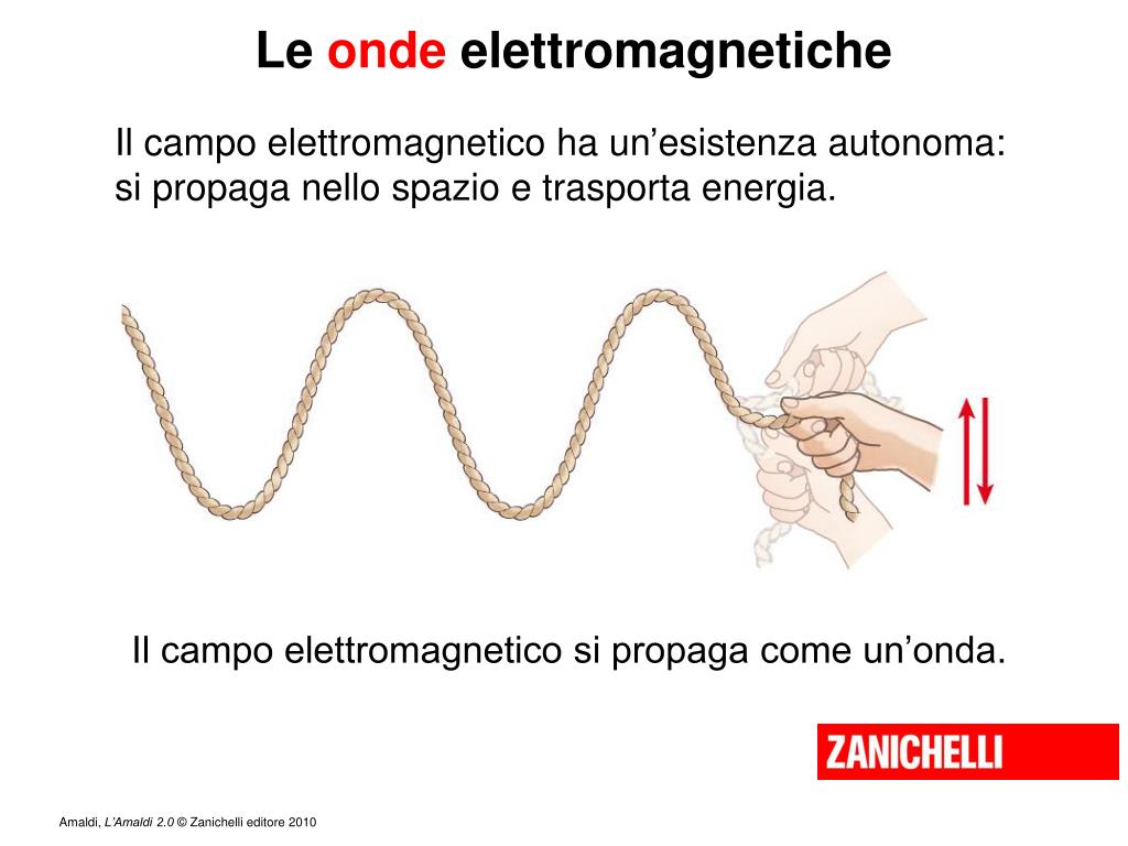 Le onde elettromagnetiche Il campo elettromagnetico ha un’esistenza autonoma: si propaga nello spazio e trasporta energia. Il campo elettromagnetico si propaga come un’onda.