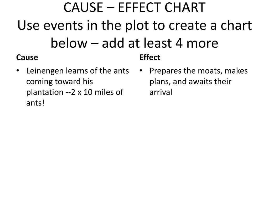 CAUSE – EFFECT CHARTUse events in the plot to create a chart below – add at least 4 more Cause Effect Prepares the moats, makes plans, and awaits their arrival • Leinengen learns of the ants coming toward his plantation --2 x 10 miles of ants!