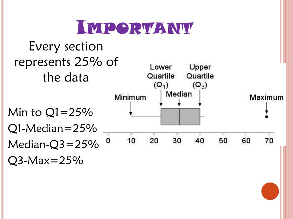 Important Every section represents 25% of the data Min to Q1=25% Q1-Median=25% Median-Q3=25% Q3-Max=25%