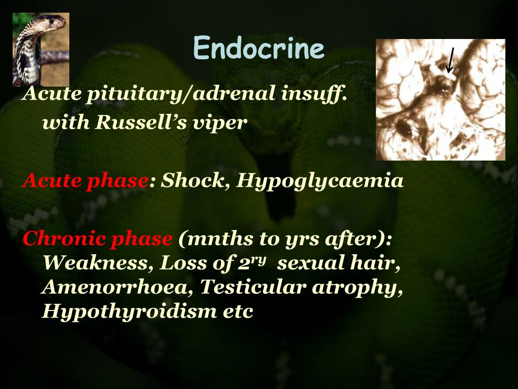 Endocrine Acute pituitary/adrenal insuff. with Russell’s viper Acute phase: Shock, Hypoglycaemia Chronic phase (mnths to yrs after): Weakness, Loss of 2ry sexual hair, Amenorrhoea, Testicular atrophy, Hypothyroidism etc