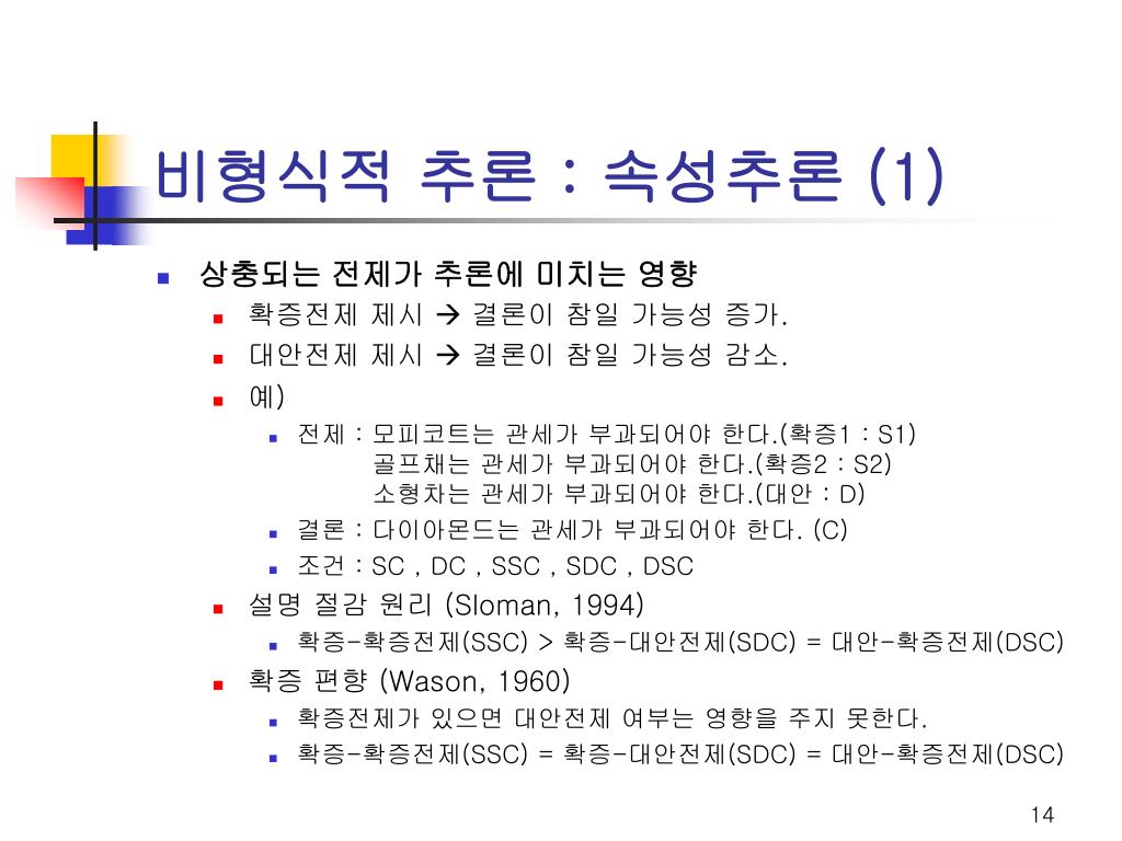 비형식적 추론 : 속성추론 (1) • 상충되는 전제가 추론에 미치는 영향 • 확증전제 제시 결론이 참일 가능성 증가. • 대안전제 제시 결론이 참일 가능성 감소. • 예) • 전제 : 모피코트는 관세가 부과되어야 한다.(확증1 : S1)골프채는 관세가 부과되어야 한다.(확증2 : S2)소형차는 관세가 부과되어야 한다.(대안 : D) • 결론 : 다이아몬드는 관세가 부과되어야 한다. (C) • 조건 : SC , DC , SSC , SDC , DSC • 설명 절감 원리 (Sloman, 1994) • 확증-확증전제(SSC) > 확증-대안전제(SDC) = 대안-확증전제(DSC) • 확증 편향 (Wason, 1960) • 확증전제가 있으면 대안전제 여부는 영향을 주지 못한다. • 확증-확증전제(SSC) = 확증-대안전제(SDC) = 대안-확증전제(DSC)