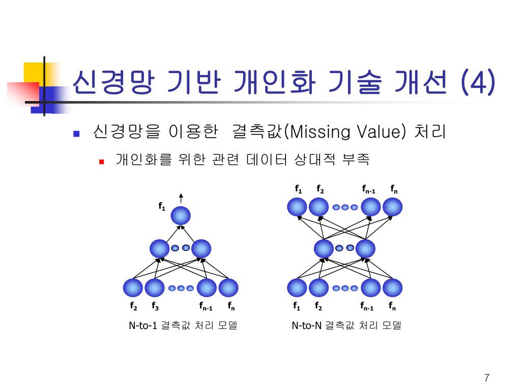 신경망 기반 개인화 기술 개선 (5) • 신경망을 이용한 결측값(Missing Value) 처리 평가 • 결측 값 처리 방법에 따른 분류 인식률 • 실험 데이터 • Iris 데이터 : 속성 4개 / 클래스 3개 / 데이터 150개 • 훈련데이터 : 100개 • 테스트데이터 : 50개 표.1 결측 값이 한 개일 경우 표.1 결측 값이 두 개일 경우