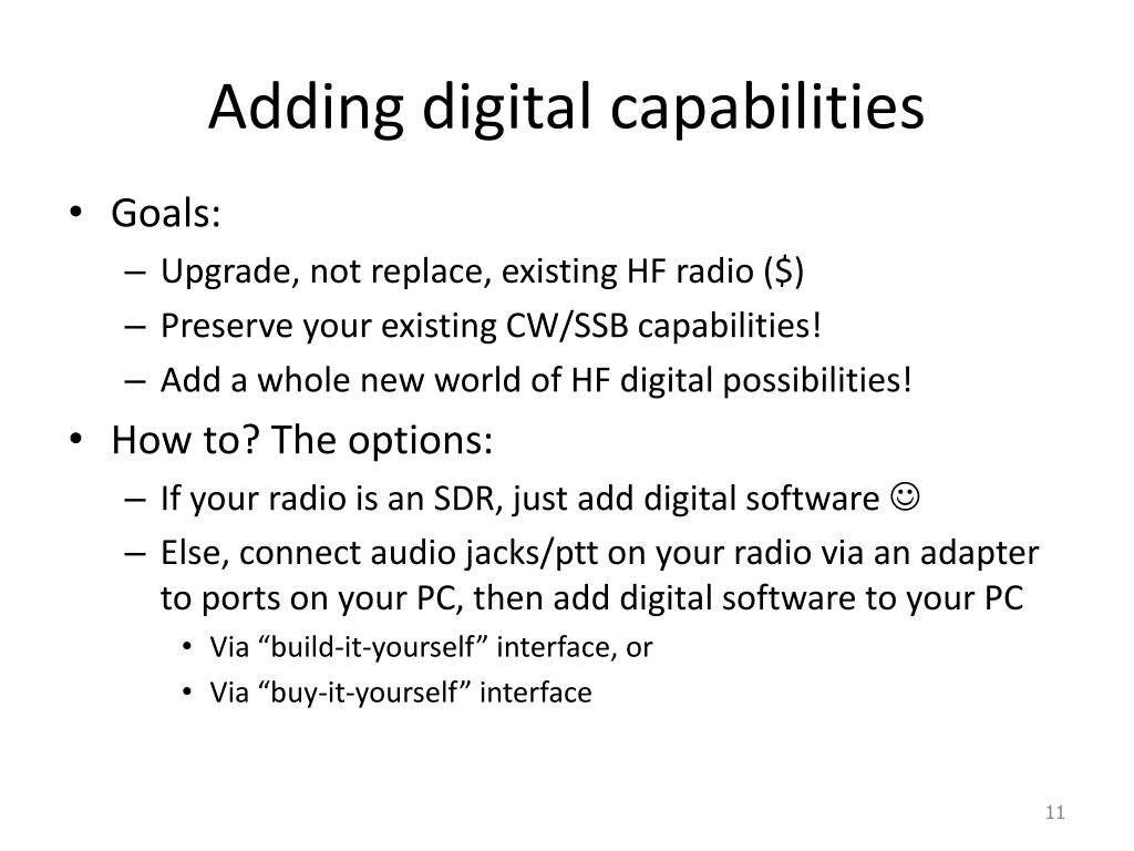 Adding digital capabilities • Goals: • Upgrade, not replace, existing HF radio ($) • Preserve your existing CW/SSB capabilities! • Add a whole new world of HF digital possibilities! • How to? The options: • If your radio is an SDR, just add digital software • Else, connect audio jacks/ptt on your radio via an adapter to ports on your PC, then add digital software to your PC • Via “build-it-yourself” interface, or • Via “buy-it-yourself” interface