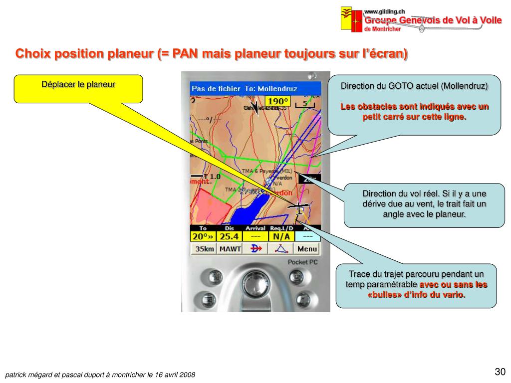 Choix position planeur (= PAN mais planeur toujours sur l’écran) Déplacer le planeur Direction du GOTO actuel (Mollendruz) Les obstacles sont indiqués avec un petit carré sur cette ligne. Direction du vol réel. Si il y a une dérive due au vent, le trait fait un angle avec le planeur. Trace du trajet parcouru pendant un temp paramétrable avec ou sans les «bulles» d’info du vario.