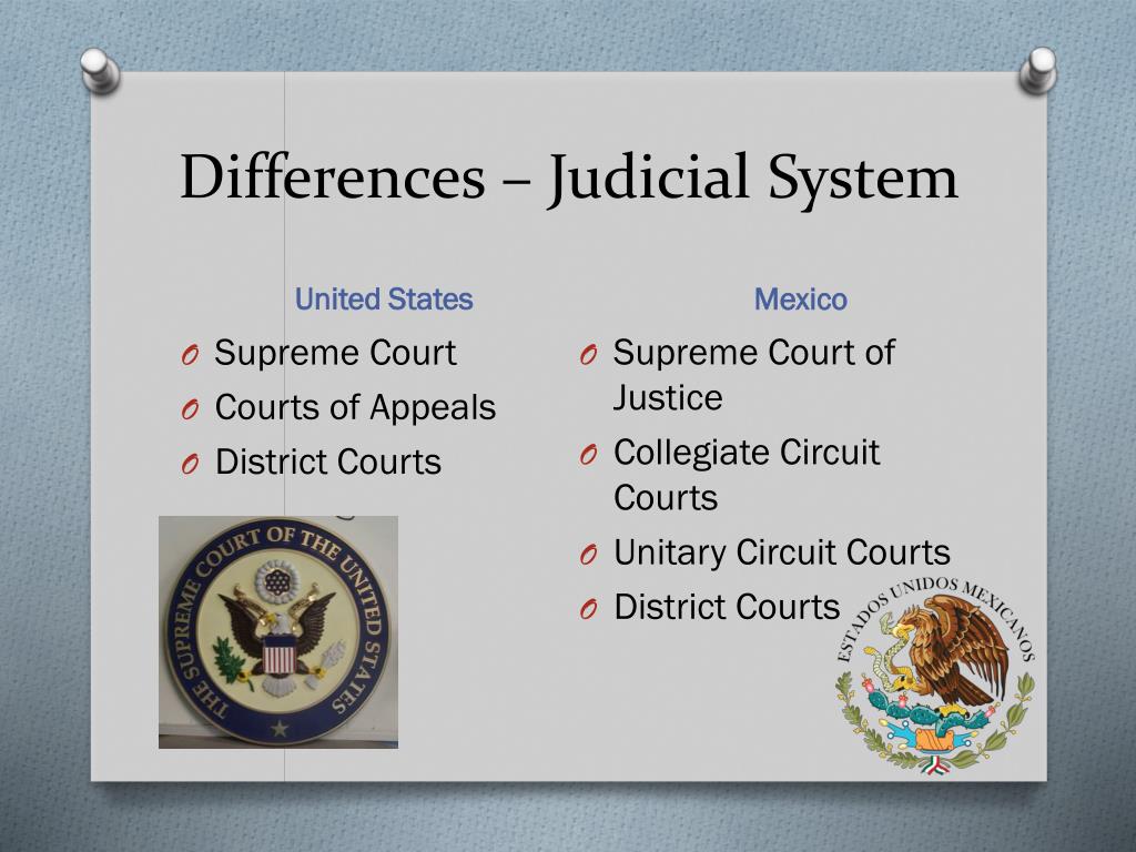 Differences – Judicial System Mexico Supreme Court Courts of Appeals District Courts Supreme Court of Justice Collegiate Circuit Courts Unitary Circuit Courts District Courts United States