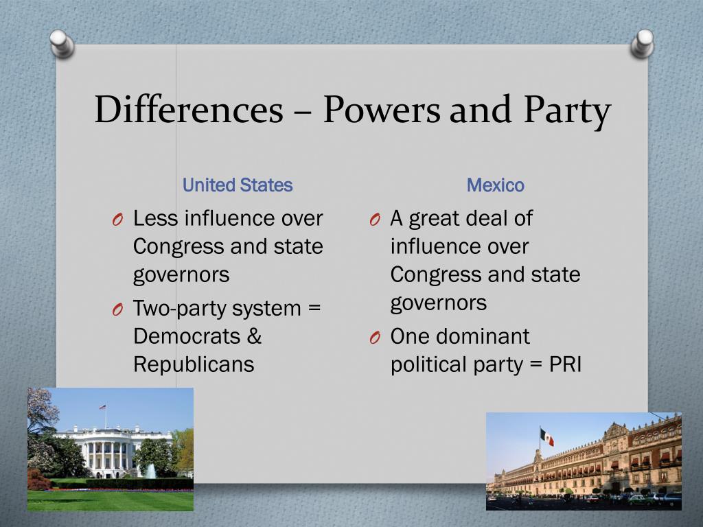 Differences – Powers and Party Mexico Less influence over Congress and state governors Two-party system = Democrats & Republicans A great deal of influence over Congress and state governors One dominant political party = PRI United States
