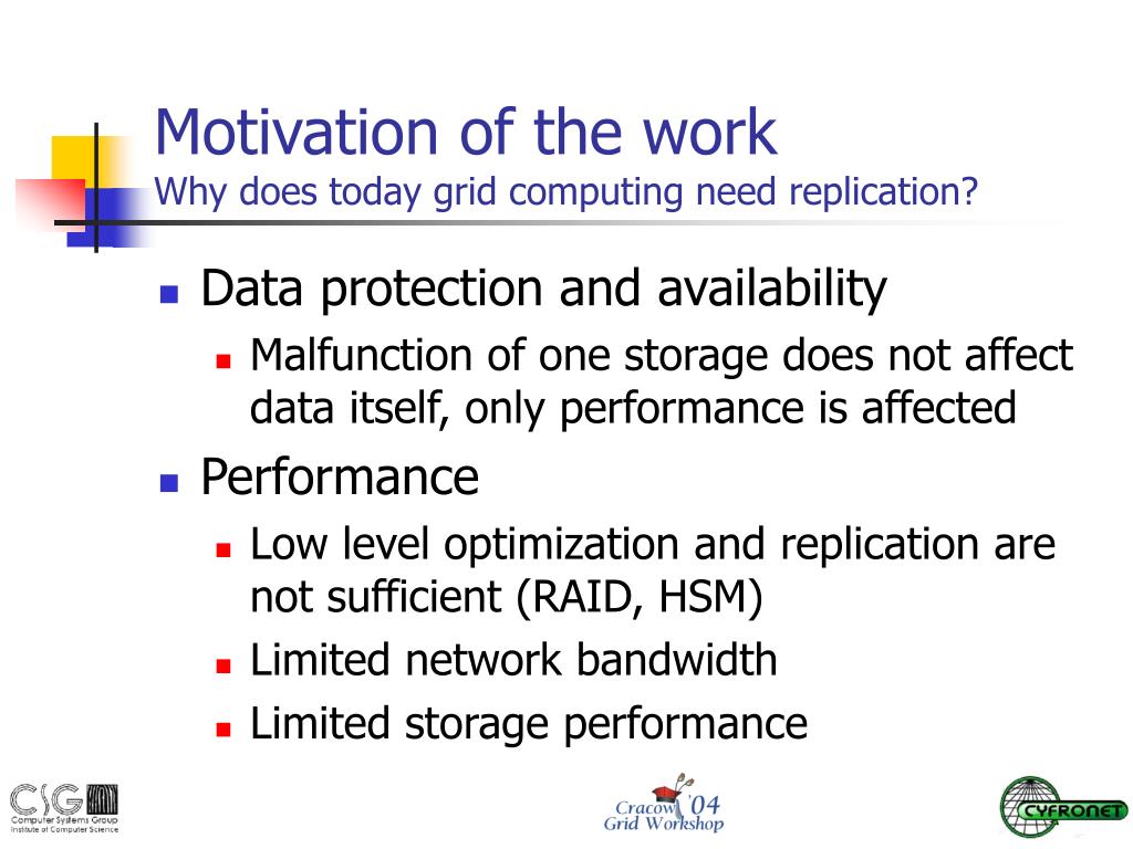 MotivationoftheworkWhy doestoday grid computing need replication? • Data protection and availability • Malfunction of one storage does not affect data itself, only performance is affected • Performance • Low level optimization and replication are not sufficient (RAID, HSM) • Limited network bandwidth • Limited storage performance