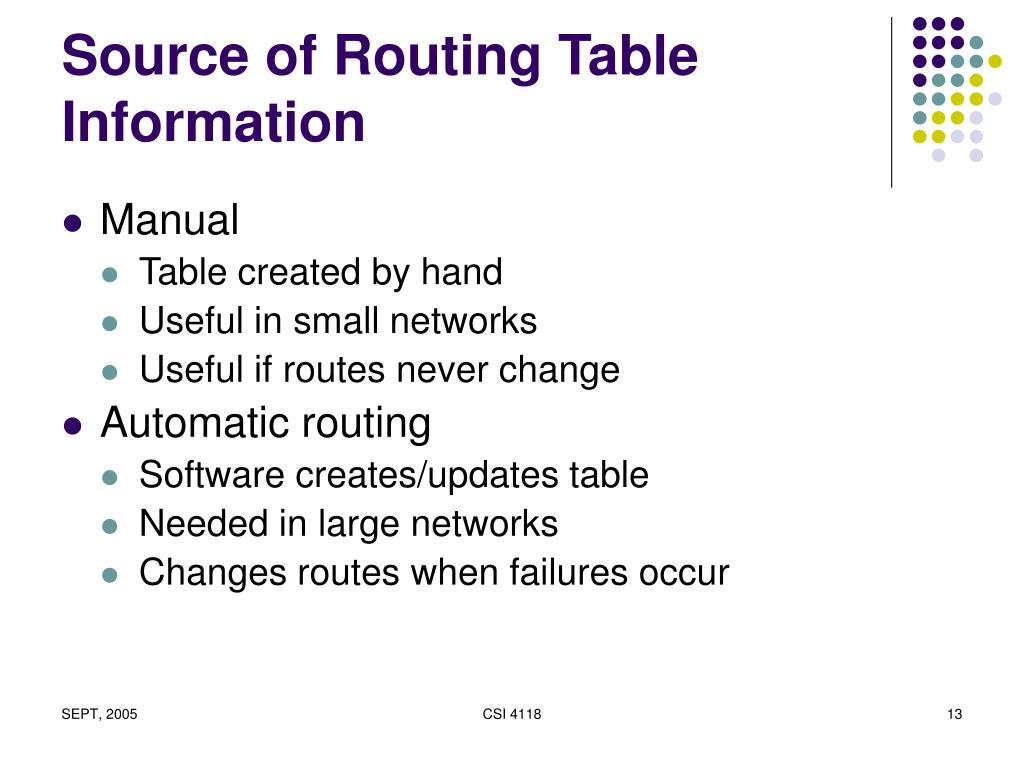 Source of Routing Table Information • Manual • Table created by hand • Useful in small networks • Useful if routes never change • Automatic routing • Software creates/updates table • Needed in large networks • Changes routes when failures occur CSI 4118