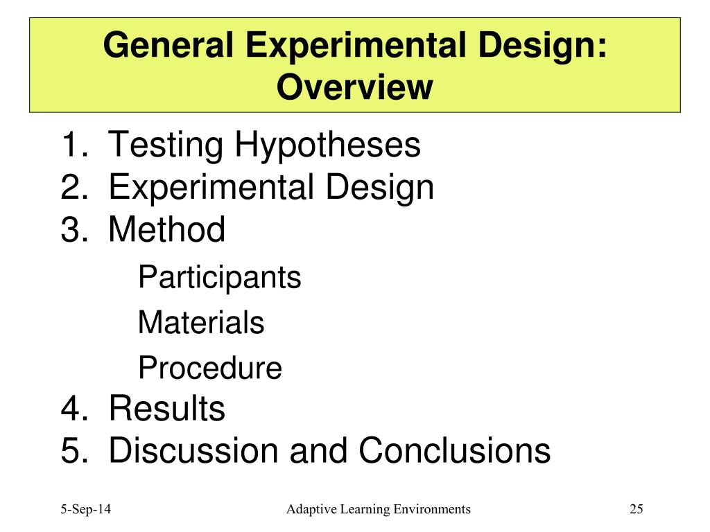 General Experimental Design: Overview • Testing Hypotheses • Experimental Design • Method • Participants • Materials • Procedure • 4. Results • 5. Discussion and Conclusions Adaptive Learning Environments