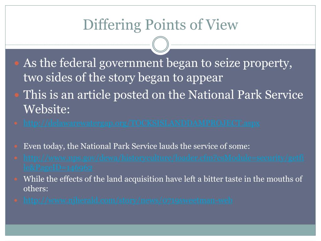 Differing Points of View As the federal government began to seize property, two sides of the story began to appear This is an article posted on the National Park Service Website: http://delawarewatergap.org/TOCKSISLANDDAMPROJECT.aspx Even today, the National Park Service lauds the service of some: http://www.nps.gov/dewa/historyculture/loader.cfm?csModule=security/getfile&PageID=146962 While the effects of the land acquisition have left a bitter taste in the mouths of others: http://www.njherald.com/story/news/0719sweetman-web