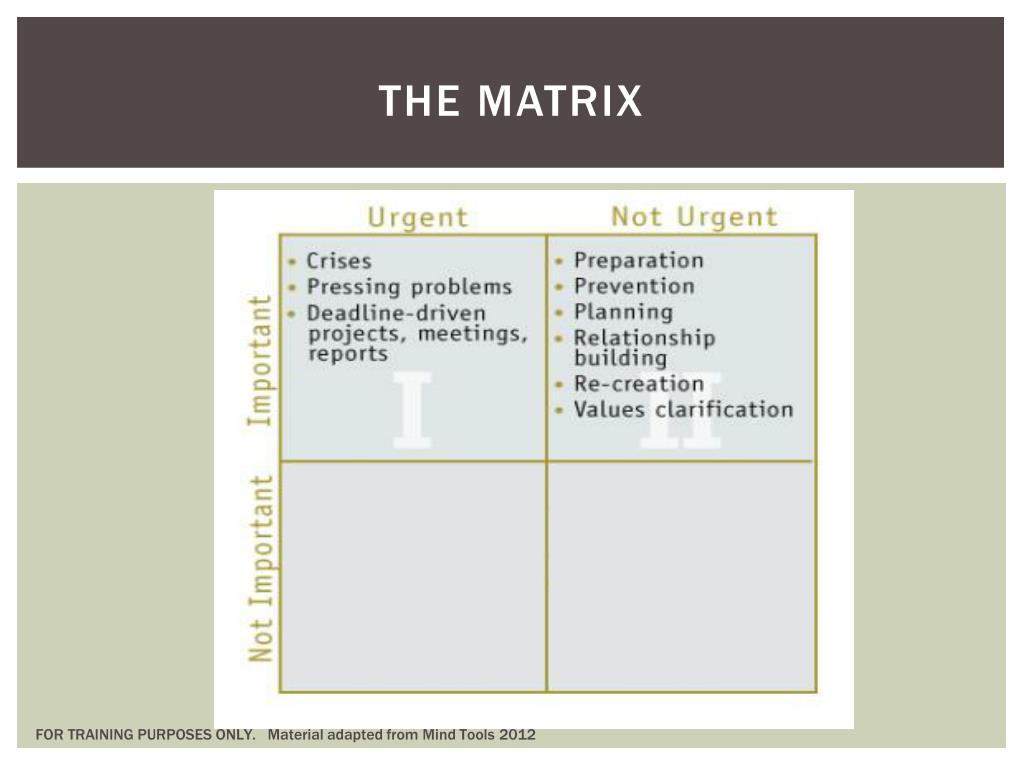 The matrix FOR TRAINING PURPOSES ONLY. Material adapted from Mind Tools 2012