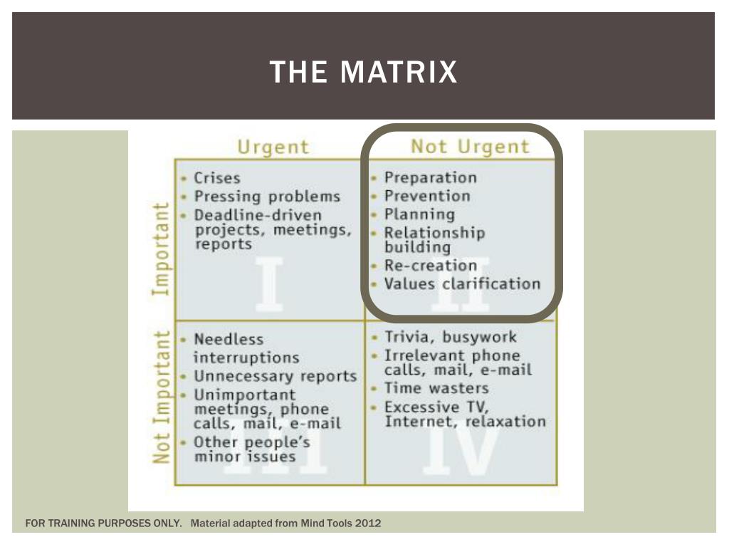 Let’s face it… ‘What is important is seldom urgent and what is urgent is seldom important’ - Dwight D. Eisenhower FOR TRAINING PURPOSES ONLY. Material adapted from Mind Tools 2012
