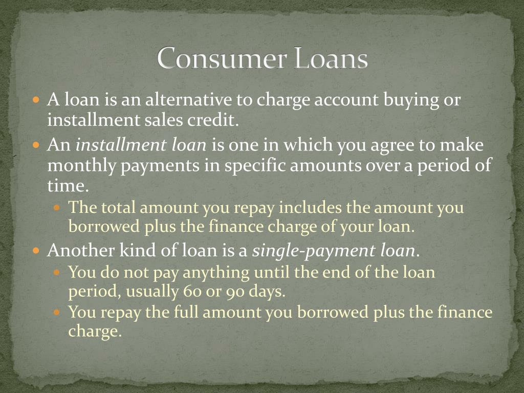 Consumer Loans • A loan is an alternative to charge account buying or installment sales credit. • An installment loan is one in which you agree to make monthly payments in specific amounts over a period of time. • The total amount you repay includes the amount you borrowed plus the finance charge of your loan. • Another kind of loan is a single-payment loan. • You do not pay anything until the end of the loan period, usually 60 or 90 days. • You repay the full amount you borrowed plus the finance charge.