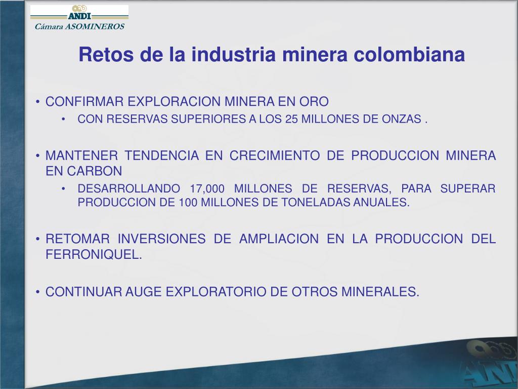 Cámara ASOMINEROS Retos de la industria minera colombiana • CONFIRMAR EXPLORACION MINERA EN ORO • CON RESERVAS SUPERIORES A LOS 25 MILLONES DE ONZAS . • MANTENER TENDENCIA EN CRECIMIENTO DE PRODUCCION MINERA EN CARBON • DESARROLLANDO 17,000 MILLONES DE RESERVAS, PARA SUPERAR PRODUCCION DE 100 MILLONES DE TONELADAS ANUALES. • RETOMAR INVERSIONES DE AMPLIACION EN LA PRODUCCION DEL FERRONIQUEL. • CONTINUAR AUGE EXPLORATORIO DE OTROS MINERALES.