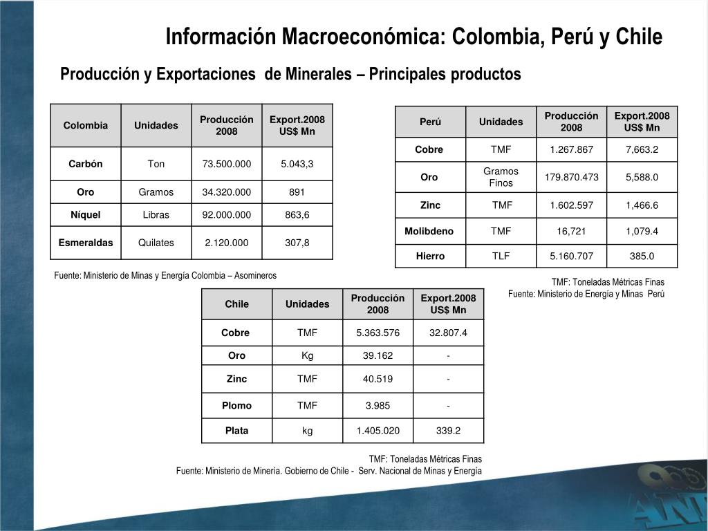 Información Macroeconómica: Colombia, Perú y Chile Producción y Exportaciones de Minerales – Principales productos Fuente: Ministerio de Minas y Energía Colombia – Asomineros TMF: Toneladas Métricas Finas Fuente: Ministerio de Energía y Minas Perú TMF: Toneladas Métricas Finas Fuente: Ministerio de Minería. Gobierno de Chile - Serv. Nacional de Minas y Energía
