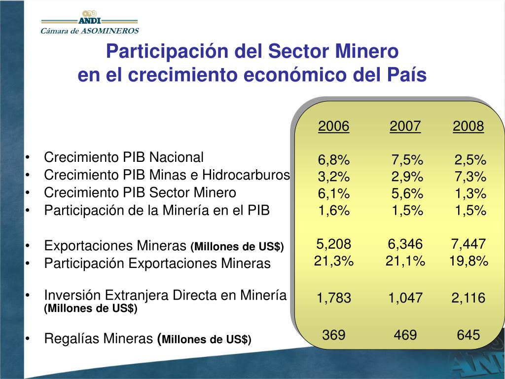 Cámara de ASOMINEROS Participación del Sector Minero en el crecimiento económico del País 2006 6,8% 3,2% 6,1% 1,6% 5,208 21,3% 1,783 369 2007 7,5% 2,9% 5,6% 1,5% 6,346 21,1% 1,047 469 2008 2,5% 7,3% 1,3% 1,5% 7,447 19,8% 2,116 645 • Crecimiento PIB Nacional • Crecimiento PIB Minas e Hidrocarburos • Crecimiento PIB Sector Minero • Participación de la Minería en el PIB • Exportaciones Mineras (Millones de US$) • Participación Exportaciones Mineras • Inversión Extranjera Directa en Minería (Millones de US$) • Regalías Mineras (Millones de US$)