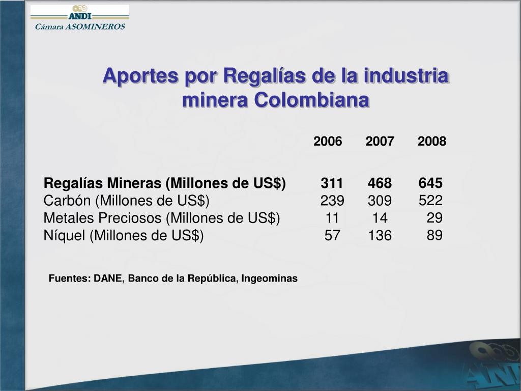 Cámara ASOMINEROS Aportes por Regalías de la industria minera Colombiana 2006 2007 2008 Fuentes: DANE, Banco de la República, Ingeominas