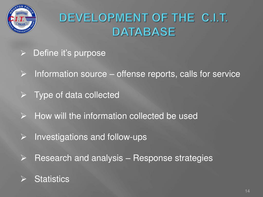DEVELOPMENT OF THE C.I.T. DATABASE • Define it’s purpose • Information source – offense reports, calls for service • Type of data collected • How will the information collected be used • Investigations and follow-ups • Research and analysis – Response strategies • Statistics