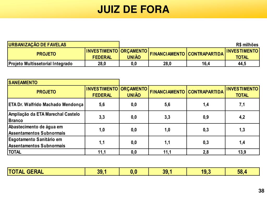 MUNICÍPIOS > 150 MIL HABITANTES LÓGICA DAS INTERVENÇÕES • ABASTECIMENTO DE ÁGUA • ESGOTAMENTO SANITÁRIO • URBANIZAÇÃO DE FAVELAS MUNICÍPIOS BENEFICIADOS • DIVINÓPOLIS • GOVERNADOR VALADARES • IPATINGA • JUIZ DE FORA • MONTES CLAROS • POÇOS DE CALDAS • UBERLÂNDIA